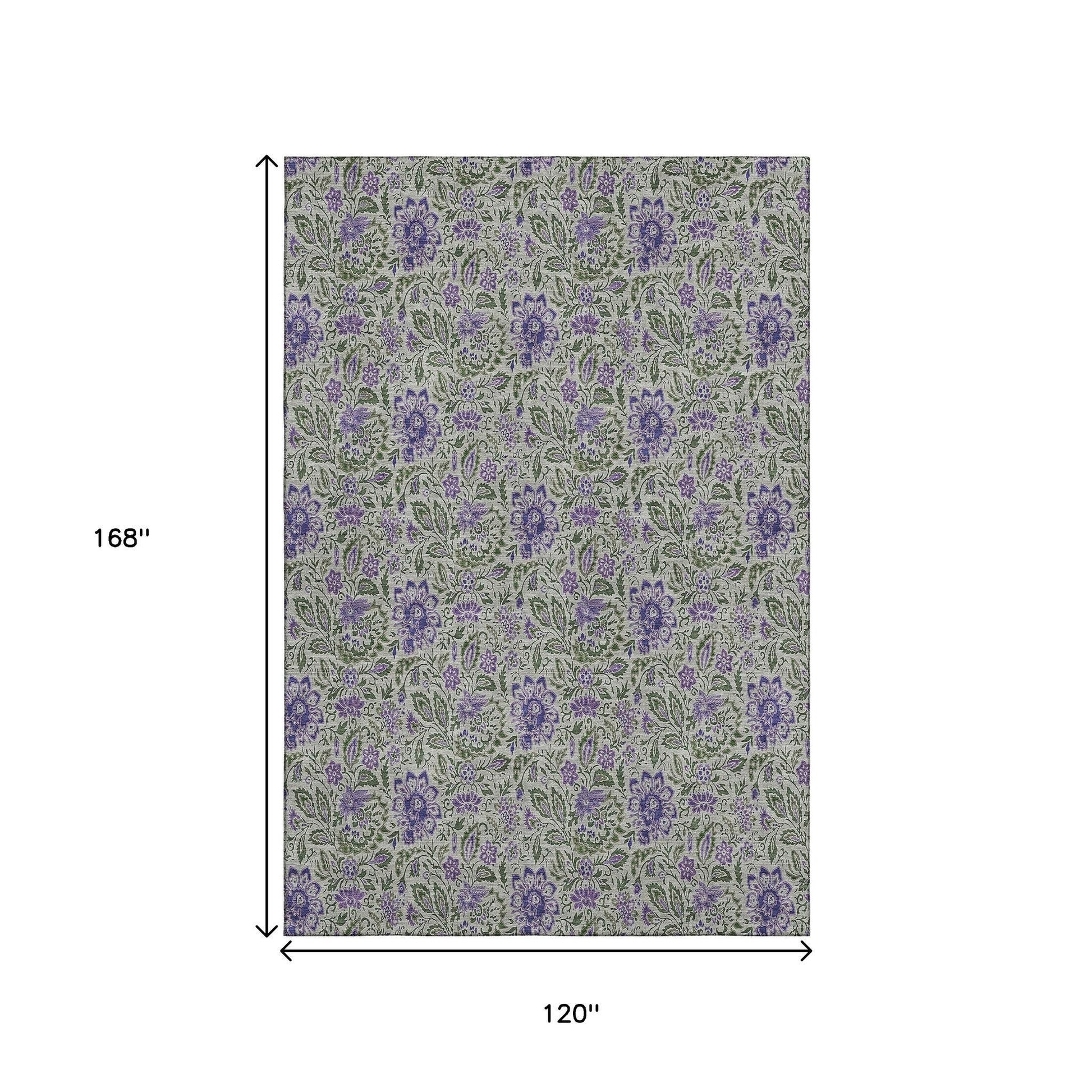 10' X 14' Olive Green And Purple Floral Washable Area Rug With UV Protection